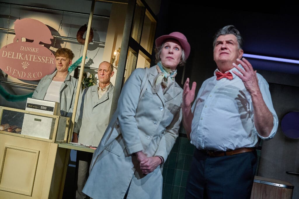 Das Reduzierte tut der Inszenierung gut, sodass ich mir manches Mal noch etwas mehr vom Reduzierten wünschen würde: vielmehr weniger. Ohne das Reduzierte und mit gewollten Untermalungen kippt die Balance zwischen Ernsthaftigkeit und Humor und driftet gelegentlich ab ins Klamaukige. Als die im Svends Kühlkammer Erfrierenden, nicht nur „You´re as cold as ice“, sondern auch noch „Hello from the other side“ und „Ice, ice, baby“ trällern oder als die gelungene Szene der ersten großen Ladendrängelei, die hier eindrucksvoll mit so wenigen dargestellt wird, sich im zweiten Teil unnötig wiederholt und in dieser Dopplung leicht albern wirkt. Ebenso wie die winkenden Gesten am Grabstein. Diese kleinen Portionen sind schon ein Zuviel, für die Tragik, die der Geschichte – mit jeder ihrer Figuren – innewohnt. Schauspielerisch sticht vor allem Steven Ricardo Scholz hervor, der in insgesamt fünf Rollen zu sehen ist und insbesondere als Aigil (der jüngere Bruder von Svends Kompagnon Bjarne), der die Tiere liebt, überzeugt. Unterm Strich liefern Regieteam und Ensemble einen ebenso ordentlichen wie kurzweiligen Theaterabend ab, und ich ziehe den Hut vor allen Beteiligten, die sich getraut haben, sich gemeinsam an den Filmklassiker Dänische Delikatessen (hier: in der für die Bühne bearbeiteten Fassung von Florian Battermann und Jan Bodinus) zu wagen.