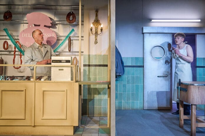 Dänische Delikatessen – als ich diesen Film aus dem Jahr 2003 (Drehbuch und Regie: Anders Thomas Jensen) zum ersten Mal sah, war ich geflasht – und habe ihn gleich noch zwei weitere Male gesehen, mit wachsender Begeisterung. Die Geschichte samt Erzählart hatte mich gepackt. Die Figuren so uneitel wie schräg, jede von ihnen in der eigenen Wirklichkeit steckend, weil sie unterwegs irgendwo gescheitert ist. Dieses Erzählen, in dem moralisch Verurteiltes so leicht daherkommt. Das Normalisieren des Absurden. Dieser Kniff, der darstellt ohne Bewertung, und verstärkt. Für mich sind die Filme von Anders Thomas Jensen höchst theatral. Wie also bringt man das Filmisch-Theatrale auf die Bühne? Wie will man den Schlachter Svend (im Film: Mads Mikkelsen) darstellen, der erst aus Versehen und dann aus seiner Misere heraus Menschen schlachtet (und anschließend filetiert), um endlich auch mal ein bisschen Anerkennung und Achtung zu ernten? Das sind große Fußstapfen, sehr große Fußstapfen. Ich bin neugierig und kann es nur schwer verknusen, dass das Theatererlebnis noch einmal mehr auf sich warten ließ, weil die Vorstellung krankheitsbedingt verschoben wurde. Ja, auch im Theater gibt´s das. Guck ich mir den Film vorher noch einmal an? Steige ich nochmal tief ein in die Filmemacherei von Anders Thomas Jensen? Nein. Es ist besser, wenn die Erinnerung an den Film nicht mehr ganz frisch ist, beschloss ich und möchte mich nicht als Publikum in den Reihen haben. Die Latte hängt hoch. Aber: Mit Mads Mikkelsen muss man sich nicht messen wollen und auch mit Anders Thomas Jensen nicht. Wirklich nicht. Fest steht: Mutig ist es, diesen Stoff auf die Bühne zu bringen.
