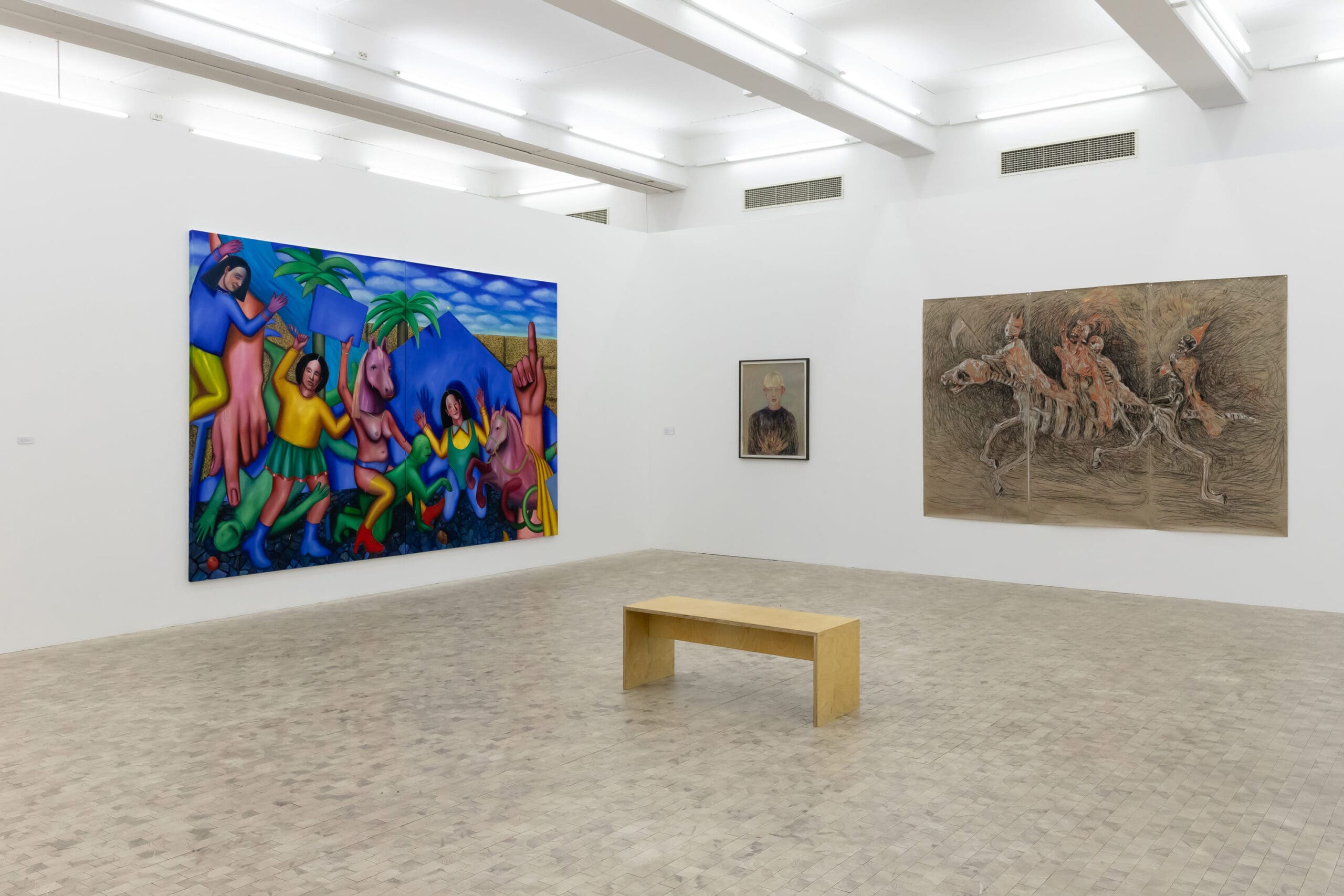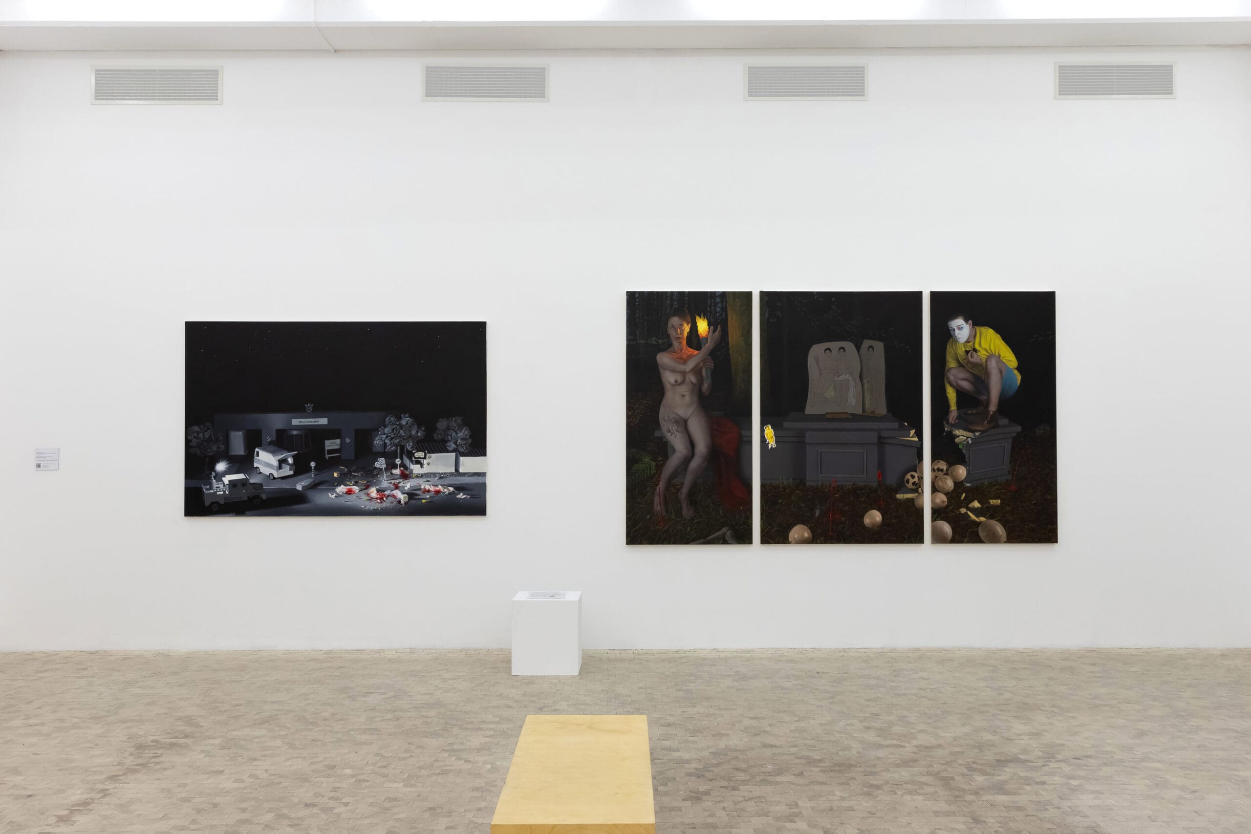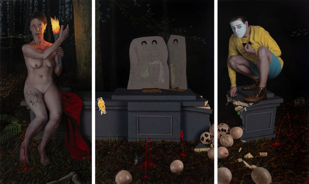 Die Werke hängen nebeneinander an der Stirnseite eines der Ausstellungsräume. Beide Werke sind düster gehalten, der dunkle Hintergrund lenkt den Blick auf die Objekte und lässt sie förmlich aus den Bildern heraustreten. Im Triptychon „Der Hausrat der Nation“ sehen wir eine unwirkliche, surreal anmutende Szene. Ein kaputtes Podest im Wald, darauf auf der linken Seite sitzend eine nackte Frau mit Fackel, auf der rechten hockt ein Mann im gelben Pullover, das Gesicht weiß geschminkt. Die beiden Modelle an den Seiten ziehen den Blick auf sich, das Zentrum bleibt seltsam unbesetzt. Nur zwei Pappaufsteller mit skizzenhaft gezeichneten Frauenfiguren füllen die Leerstelle, doch bleiben sie im Hintergrund. Die Mitteltafel wird dominiert durch ein kleines Detail in der linken Bildmitte: Weiß umrandet und etwas schräg, wie ein Sticker, nachträglich auf das Bild geklebt, ein in emoji-gelb gehaltenes nacktes Paar. Aus dem Waldboden sprudelt Blut, rosafarbene Luftballons quellen aus dem Bruch im Podest, das offenbar gar nicht aus Marmor, sondern bloß aus bemaltem Holz zu bestehen scheint.