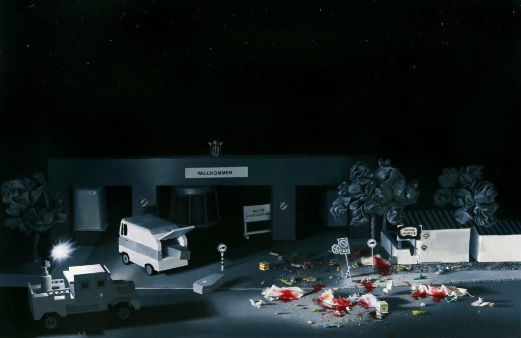 Auch diese Szene wirkt seltsam unecht, bei aller figürlichen Akkuratesse und fotorealistischer Darstellung verfremdet. Bei genauerem Hinsehen ist zu erkennen: Der Pick-up ist aus Lego zusammengesetzt – ebenso der Leichenwagen dahinter. Die Baumkronen im Hintergrund scheinen aus zusammengeknülltem Papier zu bestehen. Das Bild zeigt keine reale Szene, es zeigt ihren modellhaften Nachbau. Der Titel des Werkes gibt Aufschluss um welche Szene es sich handelt: „München leuchtet (Theresienwiese Deutscher Herbst)“. Es ist der Eingang zum Oktoberfest in München, kurz nach dem Attentat im Jahr 1980. Bei diesem bisher schwersten Terroranschlag in der Geschichte der Bundesrepublik explodierte eine Bombe vor dem Eingang zur Festwiese und riss 13 Menschen in den Tod. 221 wurden verletzt. Die Ermittler kamen zu dem Schluss, dass es sich um einen Einzeltäter handelte, der womöglich erweiterten Suizid beging – obwohl nicht nur seine Mitgliedschaft in der Wehrsportgruppe Hoffmann und weitere Kontakte in die rechte Szene andere Indizien lieferten. Erst im Jahr 2020, nach Wiederaufnahme des Verfahrens, wurde das Attentat als rechtsextremer Terrorakt eingestuft.