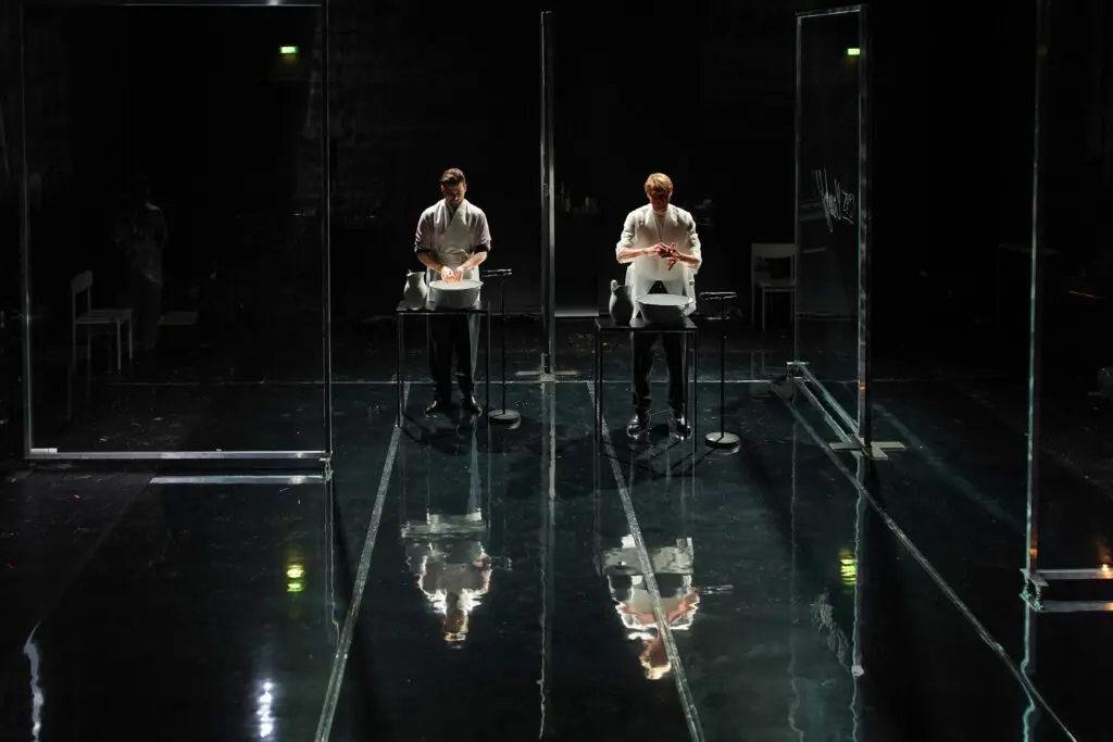 Humm und Hindenburg stehen in der Mitte der Bühne an Waschtischen, gießen sich aus Porzellankannen Wasser über die Hände und schrubben sorgfältig, während eine Stimme aus dem Hintergrund eine Mathe-Aufgabe aus den Schulbüchern des Dritten Reichs zitiert: „Der Bau eines Irrenhauses kostet sechs Millionen Reichsmark. Ein jung verheiratetes Arbeiterpaar braucht für die Erstausstattung 1.000 Mark. Wie viele Paare könnten ausgestattet werden …“