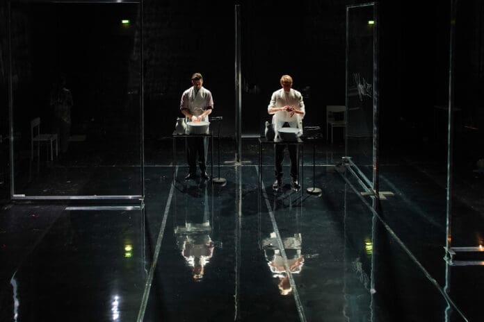 Humm und Hindenburg stehen in der Mitte der Bühne an Waschtischen, gießen sich aus Porzellankannen Wasser über die Hände und schrubben sorgfältig, während eine Stimme aus dem Hintergrund eine Mathe-Aufgabe aus den Schulbüchern des Dritten Reichs zitiert: „Der Bau eines Irrenhauses kostet sechs Millionen Reichsmark. Ein jung verheiratetes Arbeiterpaar braucht für die Erstausstattung 1.000 Mark. Wie viele Paare könnten ausgestattet werden …“