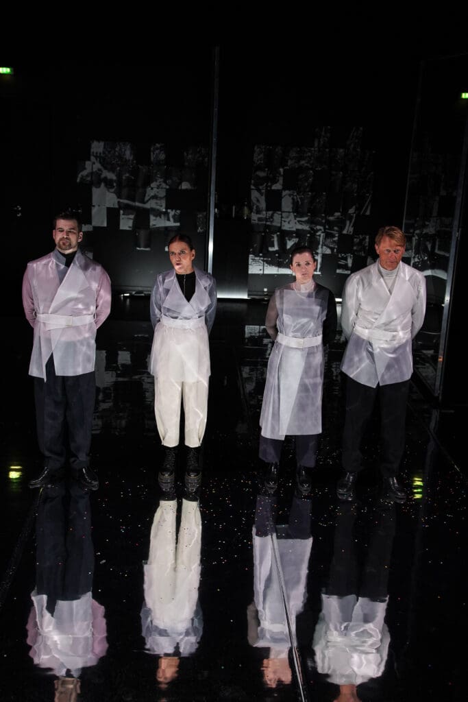 Und die Ärzteschaft? Will nach dem Krieg gar nichts gewusst, gehört, geahnt haben. „Höchstens Gerüchte – nicht Genaues – eigentlich nie – aber nicht in Schleswig-Holstein“. Solche präzise inszenierten Sprechchöre, in denen sich die vier Akteur:innen die Zitate zuwerfen, sind ein Kernelement des Stücks. Es basiert auf Briefen, Akten, Zeitungsartikeln, die Regisseurin Marie Schwesinger (Text und Regie) und der Kieler Dramaturg Jens Paulsen sammelten und aufbereiteten.