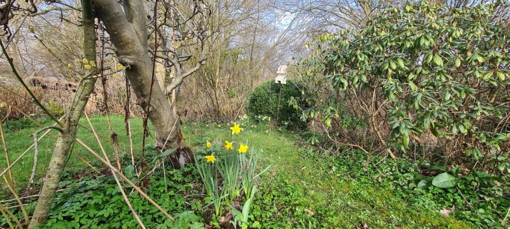 Links, der dicke Stamm gehört zu unserem Apfelbaum, ein Geretteter. Vor Jahrzehnten trocknete er in einem Hamburger Baumarkt vor sich hin, knapp 60 Zentimeter hoch. Ich nahm ihn mit und er fand seinen Platz in unserem Garten. Jeden Herbst lohnt er uns die Rettung, liefert kleine knallrote Äpfel. Poliert, ein Weihnachtstraum. Die letzten werden im Mai zu Apfelmus. Im letzten Herbst mussten wir eine Weide kappen, er bekam sie als Stütze. Und siehe da, die Weide hat gewurzelt, die ersten Kätzchen blühen. Das wird wohl eine starke Stütze, mal schauen…