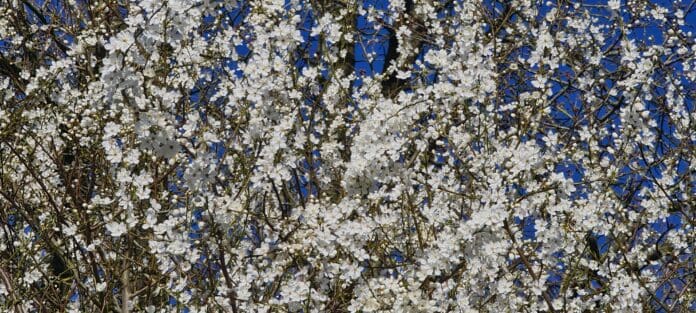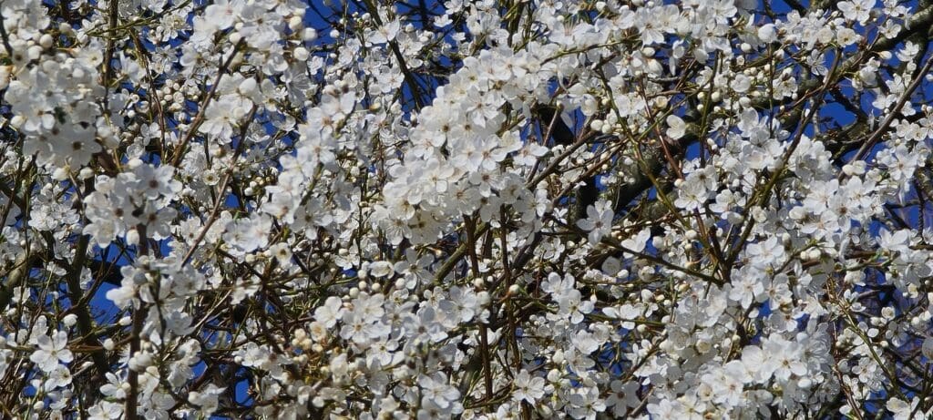 Unsere alte Blutpflaume hat der letzte Orkan komplett geknickt, glücklicherweise gab es schon eine Wildpflaume in Wartestellung. Wie die Blutbuche erfreut sie uns schon jetzt mit einem Blütenmeer. Und im Herbst gibt es aromatische Früchte, aber das kommt später. Stehen wir unter dem Baum, hören wir ein stetiges Summen. Wespen, Honig- und Wildbienen, aber auch Hummeln besuchen die Blüten. Es ist der erste gut gedeckte Tisch für die Bestäuber…
