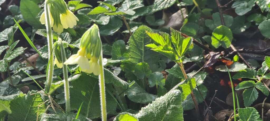 Der ganz junge Giersch, rechts, die Blätter noch nicht ganz geöffnet, reckt sich der Morgensonne entgegen. Erntezeit. Links daneben die ersten Schlüsselblumen, die werden gehegt und gepflegt.