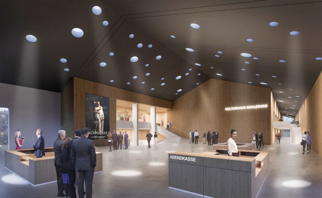 „Ein militärisches Gebäude in ein Kulturhaus verwandeln? Das ist eine bauliche Herausforderung. Dabei wollten wir viel von dem Alten noch sehen, behalten“, so Petersen weiter. Mit welcher Idee sein Architekturbüro schließlich überzeugte und den Wettbewerbszuschlag erhielt, zeigt er dem etwa 75-köpfigen Publikum in einem animierten Video-Rundgang durch das künftige Kulturhaus: Ein vorgeschobenes Foyer mit Sternenhimmel aus unterschiedlich großen Dachfenstern und großen Glasfronten im Eingangsbereich öffnet sich Richtung Stadt und lenkt den Blick auf die Schlei.