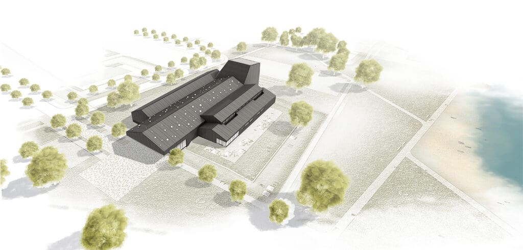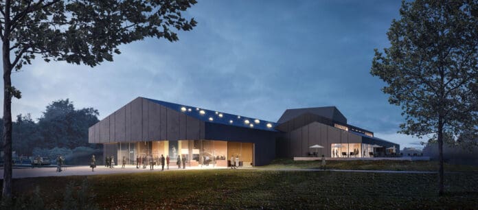 „Das ist der große Empfang, die Bühne für die Menschen. Das war uns wichtig. Das ist das Ereignis, ein Empfang mit offenen Armen und mit wenig Schwelle“, beschreibt Petersen den Grundgedanken dahinter. Für den dahinterliegenden Saal samt Bühne und Orchestergraben werden vorhandene Ebenen und Wände integriert. „Es muss ein wandelbarer Saal sein!“, das sei bei den Vorgaben zu Umbau und Budget von Anfang an klar gewesen, macht Petersen deutlich. Logistikbereiche, Gastronomie und Parkplätze sind klug um das Zentrum arrangiert. Außen zeigt sich das Theater mit einer markanten Fassadengestaltung aus schwarzen EPDM-Bahnen, die im Inneren kontrastreich mit hölzernen Wänden kombiniert werden.