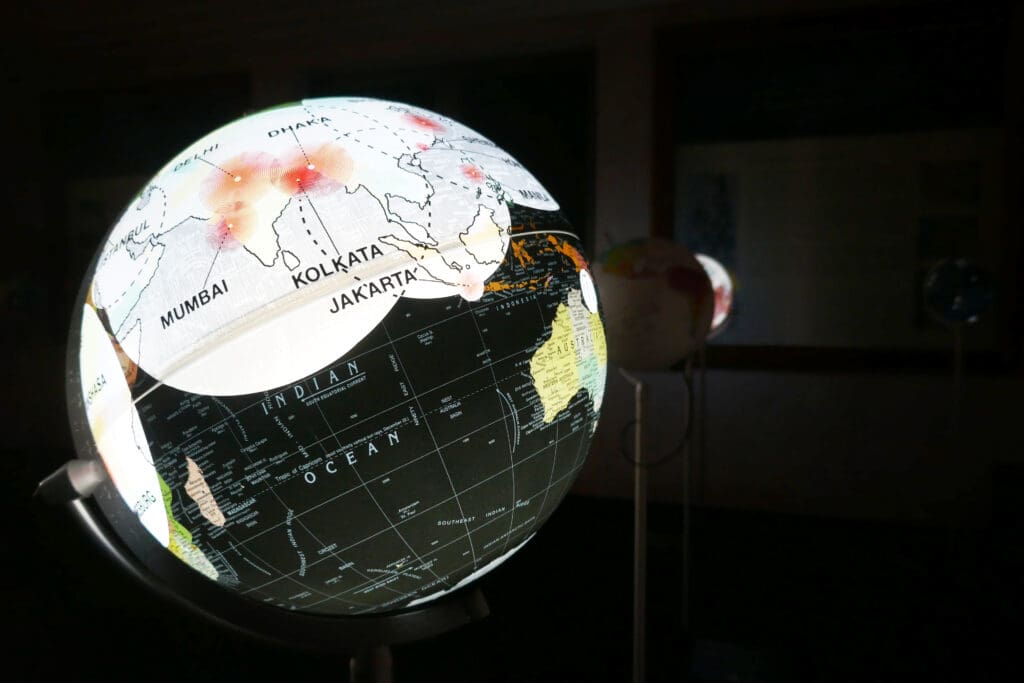Ingo Günther steht in dem halbdunklen Raum, in dem die ersten der 24 Globen schon leuchten und weitere auf ihre Montage warten. Der Künstler, 1957 in Bad Eilsen geboren, ist aus New York angereist, wo er lebt und arbeitet. Er hat für die Ausstellung in Schleswig eine Auswahl aus seinem „Worldprocessor“ mitgebracht. Das Ausgangsmaterial sind Leucht-Globen, die Günther bemalt oder beklebt. So entstehen Kunstwerke, die auf Daten basieren. Der Künstler möchte, dass die Besucher:innen nicht nur mit einem ästhetischen Gefühl, sondern auch mit einem Mehr an Wissen aus der Ausstellung gehen. Und vielleicht sogar eine Erkenntnis mitnehmen: „Ich bin dieser unsympathische Ja-Sager, der allen erzählt, dass es gar nicht schlechter, sondern in vielen Bereichen besser wird auf der Welt“, sagt Günther selbstironisch. So würden die Menschen länger leben, gleichzeitig sei die Geburtenrate weltweit rückläufig: „Die Bevölkerungsexplosion, vor der der Club of Rome in seinen frühen Szenarien gewarnt, ist nicht eingetreten.“ Trotzdem sind auf seinen Kunst-Kugeln auch negative Trends zu sehen.
