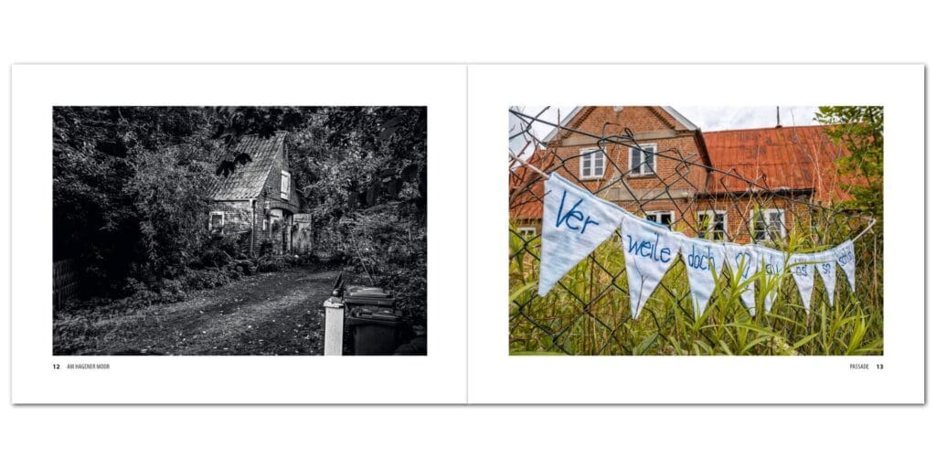 „Verweile doch, du bist so schön“ steht da zum Beispiel in blauer Schrift auf einer weißen Girlande am Gartenzaun auf einem der Bilder. Im Hintergrund ein rotes Backsteinhaus zwischen üppigem Sommergrün. Das Motiv taucht mehr als 100 Seiten später erneut auf. Doch da steht das Haus schon nicht mehr. Ein Bagger macht es dem Erdboden gleich. Noch ein Bild weiter: Die Girlande verschmutzt. Wo das rote Haus stand, nur noch ein Loch. Den Bagger aber finden wir wieder auf weiteren Fotografien. In einem der vielen Neubaugebiete rahmt sein gelber Arm ein gerade neu errichtetes Fertighaus.