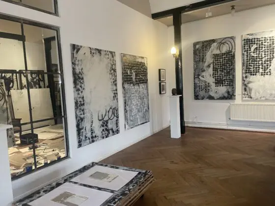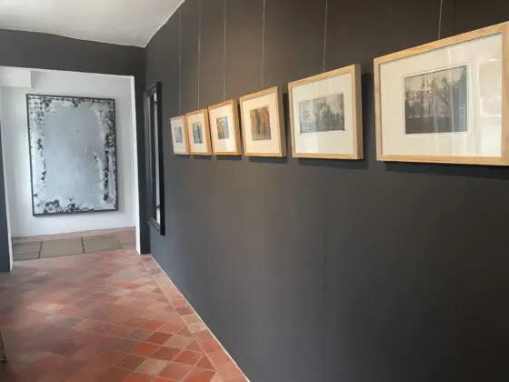 In den umgestalteten Räumlichkeiten findet sich immer noch die Kombination aus Altem und Abstraktem. Dabei hat alles einen neuen Anstrich und wirkt dabei gleichermaßen gastlich-gemütlich und inspirierend. Kunstvoll kombinieren – das gelingt dem Ehepaar seit jeher – ob beim Interieur oder in der Kunst. In der Gaststube von damals ist nun reichlich Platz für die großformatigen Werke von Franzen. Im Saal geblieben ist das nahezu deckenhohe Fenster, das ins Atelier blicken lässt.