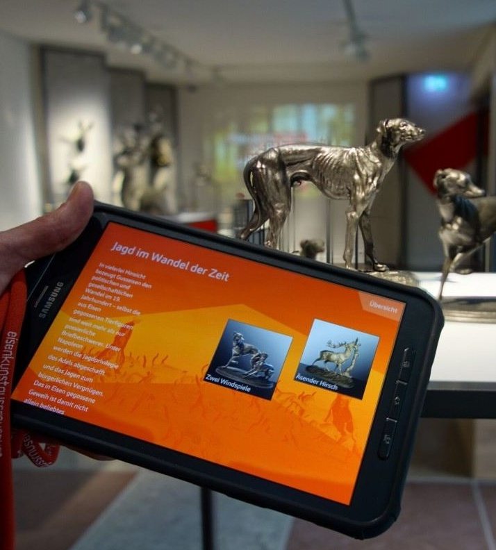 Der Grundriss des Flachbaus, den der dänische Architekt Carl Storgård entworfen hat, blieb erhalten. Das rote Leuchtband führt die Besucher:innen durch die Abteilung der „Antikenrezeption“, in der Schalen und Vasen mit klassizistischen Motiven gezeigt werden, zu den Schmuckstücken aus Eisen, die im Zuge des Krieges gegen Napoleon entstanden – „Gold gab ich für Eisen“, lautete 1813 das Motto. Es folgt eine Abteilung mit Alltagsgegenständen aus Gusseisen, ein kleiner Bereich mit Öfen – darunter solche aus Bauernhäusern mit vielen Knäufen, die sich als Taschenwärmer abschrauben lassen – und eine Abteilung, die sich der Jagd widmet. Denn röhrende Hirsche, Hunde und Wildschweine waren Lieblings-Einrichtungsgegenstände im biedermeierlichen 19. Jahrhundert, und sie bestanden natürlich aus dem Lieblings-Material der Zeit: Gusseisen.