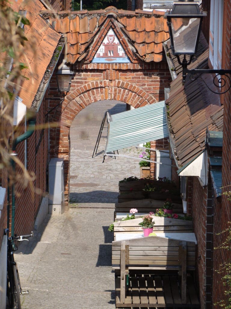 Auf halber Strecke, hinter dem Rathaus schauen wir nach rechts, die Rathaustwiete hinunter. Dort finden wir unser zweites Motiv. Ein Tor mit einer Jahreszahl, 1236 und das Stadtwappen. Es ist das Jahr in dem Plön das Lübsche Stadtrecht bekam. Nein, das ist kein mittelalterliches Stadttor, wie es viele Urlauber glauben. Erst 1928 ließ es der damalige Bürgermeister Brandenburg errichten und die Einheimischen nennen es seitdem „Brandenburger Tor“.