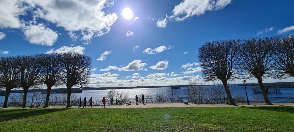 Der Aufstieg geht weiter. Unser Ziel ist die Schlossterrasse. Der Blick gehört dem See, dem Plöner See. Ost-Süd-Richtung. Wir sind fast auf Augenhöhe mit dem Turm der Nikolaikirche. Er, links von uns fast 60 Meter hoch, der See in Bahnhofsnähe ist fast 60 Meter tief. Aber Achtung Segler, Paddler und Ruderer. Richtung Süden, mitten im See, ist es an einigen Stellen flach und steinig….