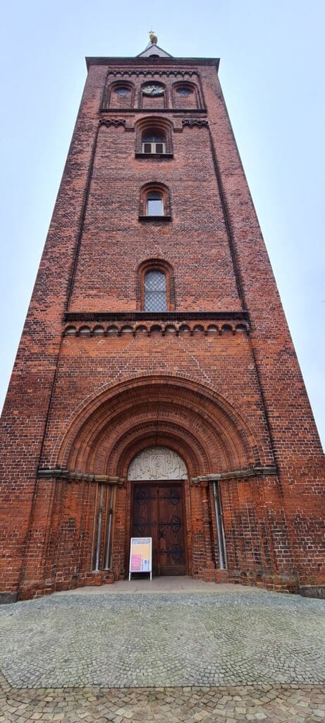 Starten wir mit der Nikolaikirche im Zentrum der Stadt. Am 24. Juni 1864 abgebrannt und in nur zwei Jahren vom preußischen Baurat Hermann Georg Krüger im neuromanischen Stil wieder aufgebaut. Wir stehen mit dem Rücken nach Westen, blicken auf den Kirchturm. Klick – rund 60 Meter hoch.