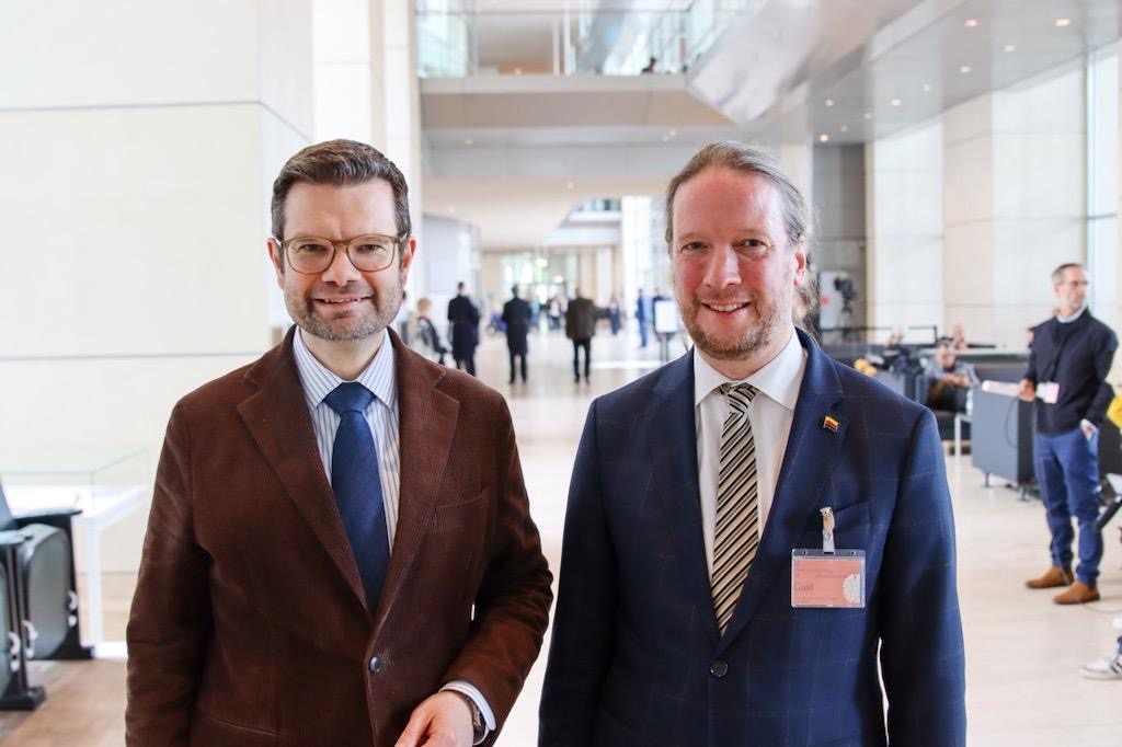 Der Direktor des Nordfriisk Instituut, Dr. Christoph G. Schmidt, überbrachte Bundesjustizminister Dr. Marco Buschmann (links) ein herzliches „foolen tunk“ für die Gesetzesänderung. (Foto: Henning Heinemann, BMJ)
