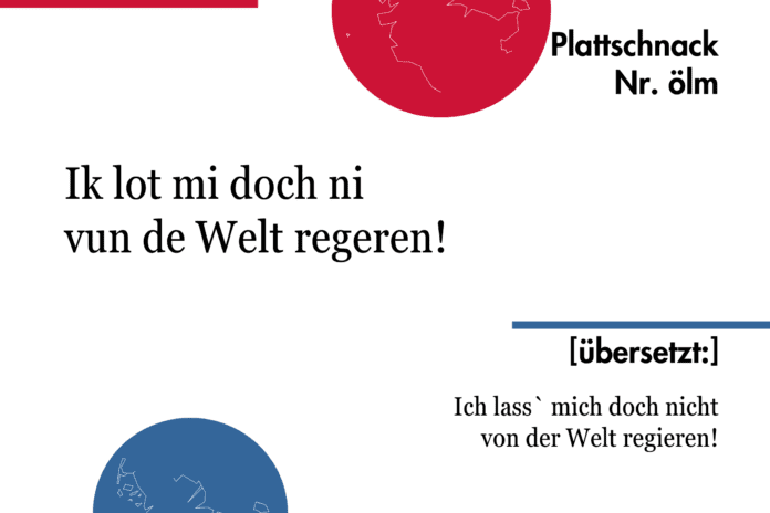 Düsse plattdüütsche Schnack kenn ik vun mien Oma. Se much dat am leevsten, wenn allens in er Taktung löppen dee. Und dorbi scherte se sik ok ni um dat, wat annere Lüüd villich dorto meenen oder seggen kunn´. Dat wer er man jüs piepegol. Denn hett se seggt: „Ik lot mi doch ni vun de Welt regeren!“ – und dör wer se dormit. Jo, dor wer se klipp und kloor mit sik. Und mit de Welt. In exakt düsse Reeg. Nee, mien Oma lött sik ni so lich beindrucken. Ni vun de Welt und ok ni vun de Lüüd. Und mit de dore Fasson is se dag-in, dag-ut wunnerbor mit torechtkomen. Jo, ik hev jüm a in Plattschnack Nr. veer een vun er Schnacks wiest.