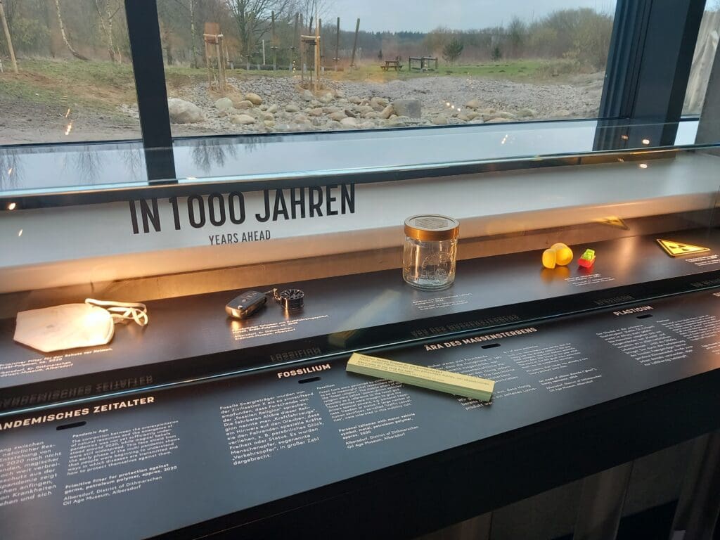 Wie schwierig es ist, aus Funden auf die Lebensweise der Menschen zu schließen, zeigt sich in der Vitrine zur „Archäologie der Zukunft“. Plastik sei wohl aus kultischen Gründen in der Landschaft verteilt worden, lautet eine These der künftigen Wissenschaftler:innen. Und Atomwaffen müssten wohl eine Art Schreckgespenst sein, schließlich könnten Menschen nie so dumm sein, den Planeten zu gefährden.