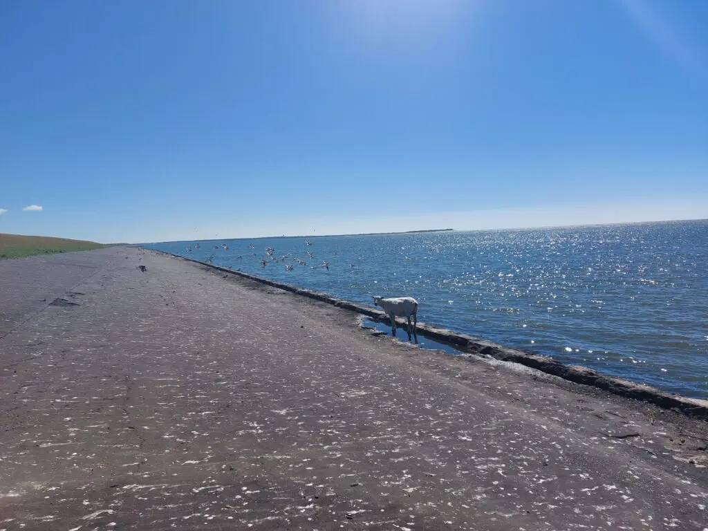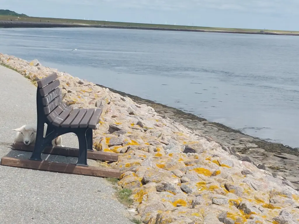 Tourist*innen in Multifunktionskleidung ziehen bei 20 Grad und Sonnenschein auf ihren E-Bikes an mir vorbei. Aber auch sie müssen alle paar hundert Meter absteigen – der Deich ist in einzelne Abschnitte unterteilt, Gatter trennen die Schafe voneinander.