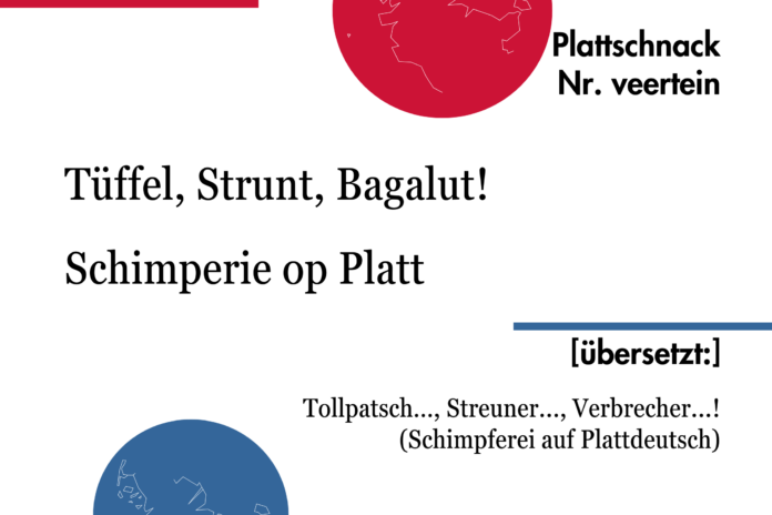 jo, ik weet: Över dat Schimpen op Platt hev ik a in Plattschnack Nr. veer schreeven. Aver dat gifft jo noch veel mehr schmucke, plattdüütsche Schimpwöör as de, de ik dor a optellt hev. Dat weern düsse dree: Schluffhack, Sempoog, Twasskopp. Nu kummt de tweete Utgov in Sooken Schimpen und Schandereern – und dörvor hev ik mi düsse dree Wöör utkieken: Tüffel, Strunt, Bagalut!