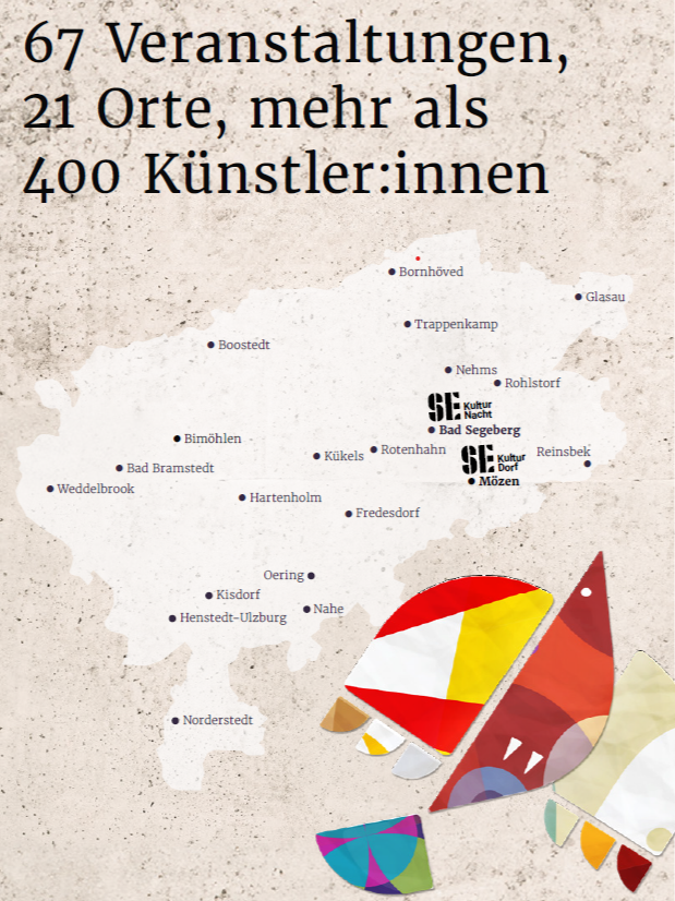 – GUT ZU WISSEN – Viele der angebotenen Veranstaltungen kosten keinen Eintritt, für einige wird um Spenden gebeten, andere sind kostenpflichtig und/oder erfordern eine Anmeldung. // Hinter den SE-Kulturtagen steht das kreisweite Projekt SE-Kultur des Vereins für Jugend- und Kulturarbeit im Kreis Segeberg e. V. (VJKA) mit der Teileinrichtung KulturAkademie Segeberg. Hier ist auch der Kulturknotenpunkt Mitte als regionale Anlaufstelle für den Kreis Segeberg und den südlichen Kreis Rendsburg-Eckernförde verortet.