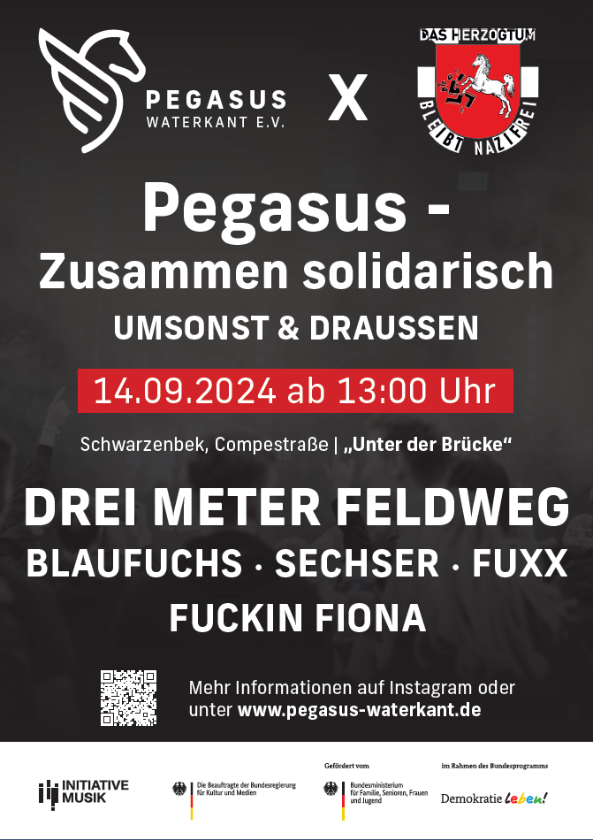 Gemeinsam mit dem Antifaschistischen Bündnis Das Herzogtum bleibt nazifrei! lädt der Pegasus Waterkant e.V. zum umsonst und draußen-Festival „Pegasus – Zusammen solidarisch“ ein. Mit dem Event soll ein Zeichen gegen Rechtsextremismus gesetzt werden. Der Veranstaltungsort war in der Vergangenheit häufiger Schauplatz rechtsextremer Angriffe auf Jugendliche. Nun soll der Platz Unter der Brücke in der Compestraße zurückerobert und zu einem Symbol für Toleranz, gelebte Demokratie und antifaschistische Haltung werden.