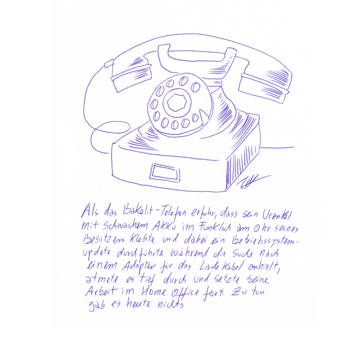 „Als das Bakelit-Telefon erfuhr, dass sein Urenkel mit schwachem Akku im Funkloch am Ohr seines Besitzers klebte und dabei ein Betriebssystemupdate durchführte während die Suche nach einem Adapter für das Ladekabel anhielt, atmete es tief durch und setzte seine Arbeit im Home Office fort. Zu tun gab es heute nichts.“