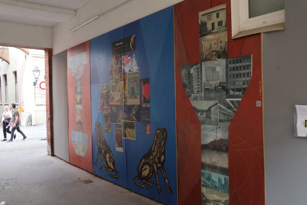 Aliens und Ruinen heißt diese Wandmalerei von Christoph Dettmeier im Durchgang von der Alfstraße 18 zur Mengestraße. Der Begleitzettel erklärt etwas umständlich, worum es geht. Kurz gesagt: eine Collage, wie ein mittelalterliches Triptychon mit zwei Flügeln, nur dass sie die 1950er und -60er Jahre thematisiert. In der Mitte Science-Fiction-Filmplakate, links Fotografien aus der BRD, rechts aus der DDR. Mit Aliens und Ruinen thematisiert Christoph Dettmeier Ängste, Hoffnungen und Mythen aus dieser Zeit – auf beiden Seiten der Mauer.