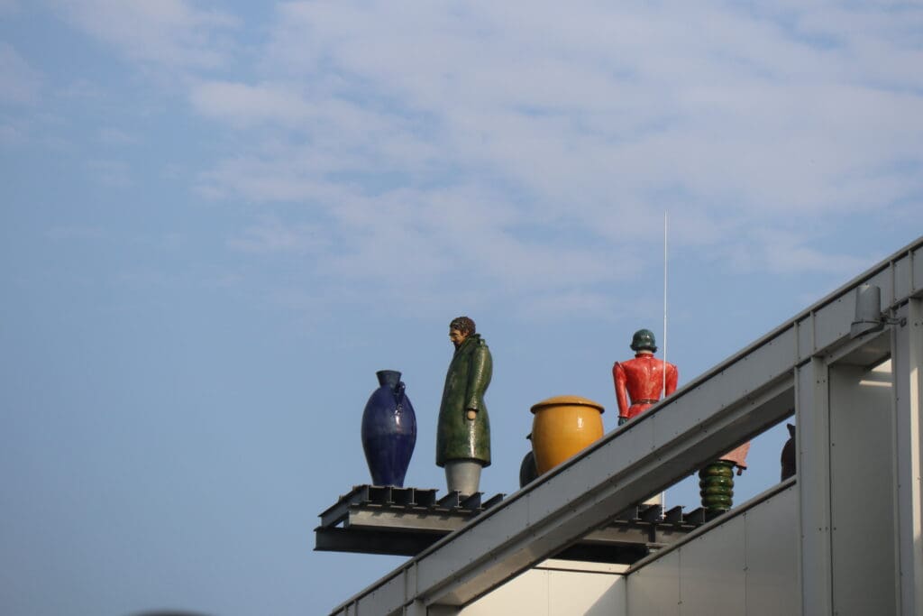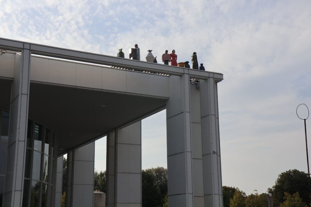 Man sieht sie schon von weitem: die Figurengruppe Die Fremden von Thomas Schütte auf dem Dach der Musik- und Kongresshalle. Die Figuren aus glasiertem Terrakotta hat der Künstler 1992 für die documenta in Kassel angefertigt.