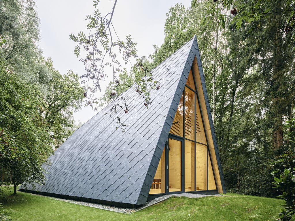 Matthias Dworzack: …deren ikonische Form einen schon vor dem Betreten des Raums fasziniert – und wer dann dort eintritt, ist einfach hingerissen von den Eindrücken, die aus dem Zusammenspiel der zwei sich gegenüberliegenden gleichschenkligen Dreiecke sowie der unbeschwerten Konstruktion aus anthrazitfarbenen Metallschindeln und hellem unbehandelten Tannenholz entstehen. Und erfüllt vom Blick durch die vollkommen verglaste Rückseite des Baus in den Wald und auf ein großes, hölzernes Kreuz zwischen den Bäumen. Eine Naturerfahrung, die im Konzert das Hörerlebnis mit all seinen Gedanken sich noch fokussierter als in jeder Philharmonie auf die Musik konzentrieren lässt.