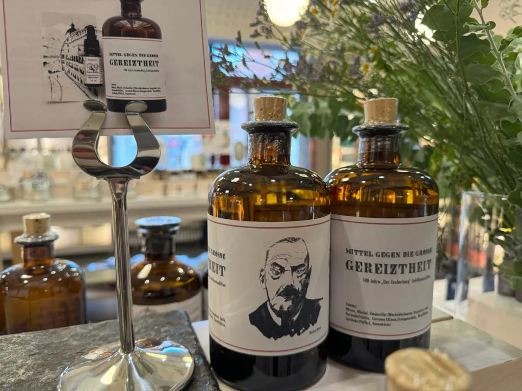 Für das Jubiläumsjahr hatte er sich den Roman allerdings noch einmal vorgenommen. Mit einem erstaunlichen Resultat: Sein von der Lektüre inspiriertes „Mittel gegen die große Gereiztheit“ sei ein Beispiel für die jahrhundertealte Apothekerkunst des Destillierens, dem physikalischen Verfahren zur Trennung von Stoffen. Name und Etikett gemahnten, „Gegensätze zu akzeptieren. Wir sagen „ja“ zu physikalischer Trennung, wir sagen „nein“ zu Streit, Unversöhnlichkeit, fehlender Toleranz und erst Recht Handgemenge, denn immer soll und muss Versöhnung das Ziel sein, gerade in unserer Zeit.“ Bei seinem selbst hergestellten Gin handle es sich allerdings nicht um ein Heilmittel, betont Niendorf. Er sei „Genussmittel durch und durch“.