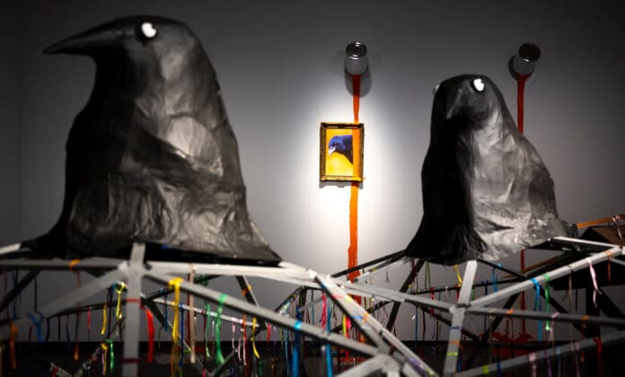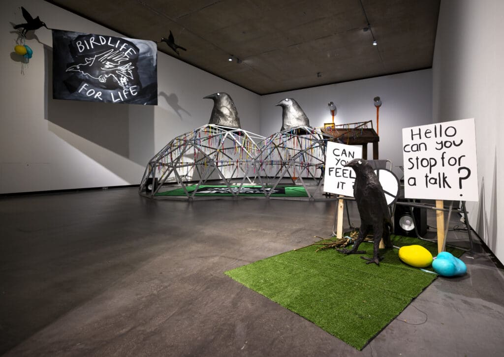 Der großen Gereiztheit begegnen wir auch in der Ausstellung „Extra Time“ in der mit den Ausstellungsräumen des St. Annen-Museums baulich verbundenen Kunsthalle St. Annen. Die renommierte Künstlerin Heather Phillipson bevölkert hier ihre sich über alle Etagen erstreckende Rauminstallation mit krähenartigen Charakteren. In einem Protestcamp fordern sie ihre Rechte ein. Im Gespräch mit Kunsthallen-Leiterin Noura Dirani erklärt Heather Phillipson dazu: „Aufgrund eines noch nie dagewesenen Ausmaßes an globalen Unruhen erleben wir derzeit ein bisher unbekanntes Ausmaß an Protest. Für mich war es wichtig, diese Unruhe zu beleuchten – das Kippen der Waage in Richtung Krieg und Konflikt, Umweltkrise und erzwungene Migration und darüber hinaus die potenzielle Kraft der Gegenwehr und ihrer Körper im Raum.“