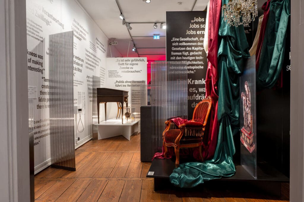 Die aktuelle Ausstellung “Der Zauberberg. Fiebertraum und Höhenrausch” im Lübecker St.-Annen-Museum widmet der großen Gereiztheit einen eigenen Raum. Während im Roman die Weltanschauungen des Humanisten Settembrini und des religiösen Fundamentalisten Naphta in ausufernden Streitgesprächen aufeinanderprallen, tun es hier aktuelle Aussagen zeitgenössischer Akteur*innen des politischen und öffentlichen Lebens in einer von den Wänden schreienden Zitatencollage. “Wir haben nur sehr versteckt dazugeschrieben, von wem die Zitate sind”, sagt Caren Heuer, die Leiterin des wegen Bauarbeiten aktuell geschlossenen Buddenbrook-Hauses, das mit der Ausstellung im St. Annen-Museum gastiert. “Damit möchten wir den Besuchenden die Möglichkeit geben, die Aussagen ganz unvoreingenommen auf sich wirken zu lassen”. Deutlich wird dabei zweierlei: Wie stark unsere Interpretation des Inhalts dadurch beeinflusst wird, wer eine Aussage trifft – ob Olaf Scholz oder Osama bin Laden – und wie aktuell die Thematik des Romans immer noch ist.