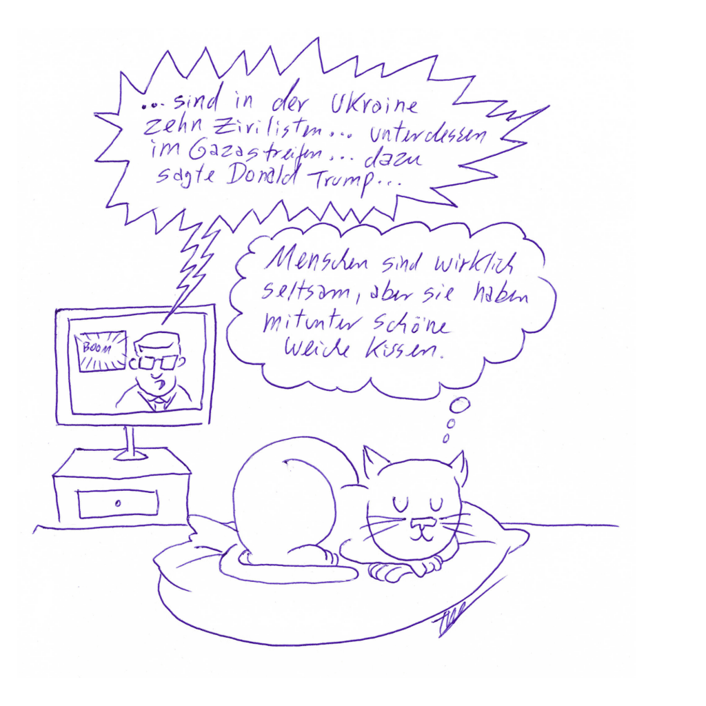 Nachrichtensprecher: … sind in der Ukraine zehn Zivilisten … unterdessen im Gazastreifen … dazu sagte Donald Trump …