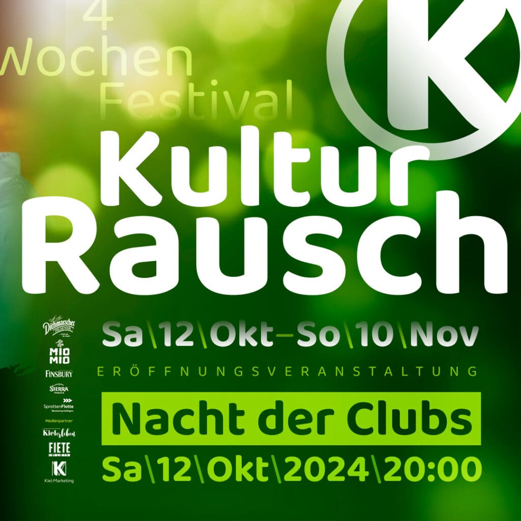 - 12. OKTOBER – 10. NOVEMBER: KULTUR-RAUSCH (MIT NACHT DER CLUBS), KIEL | Am 12. Oktober startete der Kieler Kultur-Rausch mit der Nacht der Clubs in die diesjährige Herbstausgabe. Als Zusammenschluss verschiedener Kieler Eventlocations und -veranstalter findet das vierwöchige Kulturfestival jeweils im April und Oktober statt. 13 Locations liefern ein gebündeltes und durchmixtes Programm aus Konzerten, Lesungen, DJ-Sets u.a.