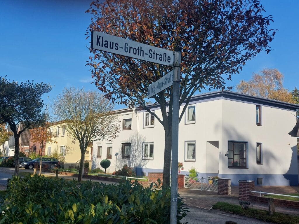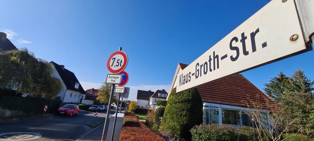 Auch die Kreisstadt Eutin ehrt Klaus Groth, indem sie 210 Meter Straße nach ihm benennt. Beschauliche Einfamilienhäuser, 30-Zone, verkehrsberuhigt. Allerdings geht das einfache Straßenschild „Klaus-Groth-Straße“ ohne weitere Erklärungen in einem Schilderwald von Ver- und Geboten unter. Zum Glück trifft das eine Ende der Straße auf die Heinrich-Wilhelm-Wisser-Straße und den kennt hier jeder. Wisser (1843-1935) war Gymnasiallehrer und sammelte plattdeutsche Märchen, was ihm den Beinamen „Märchenprofessor“ einbrachte. Dann kann der Groth nur unser Dichter Groth sein. Zwei Kämpfer für die Niederdeutsche Sprache treffen sich per Straße. Alles andere gäbe keinen Sinn.