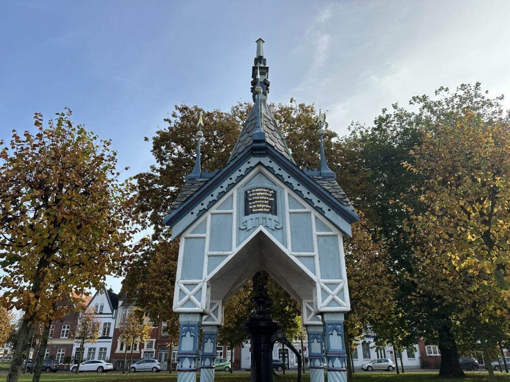 1879 wurde das Brunnenhäuschen als Überdachung der alten Marktpumpe von Architekt Heinrich Rohardt erdacht, errichtet und gestiftet. Heute ist die historische Schwengelpumpe (auch: Marktbrunnen genannt) eines der Wahrzeichen der Stadt. Wie es zu den Groth-Versen auf dem besonderen Bauwerk kam, haben wir (noch) nicht herausgefunden. Über Hinweise freuen wir uns.