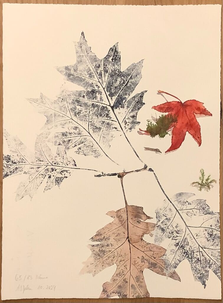 Ich gestalte eine Serie von 83 Bildern, eines für jeden Baum, der gefällt wird. Die Idee ist, dass die Pflanzen an ihren eigenen Portraits mitarbeiten. Ich nehme Zweige, Blätter oder Früchte, die mit Druckfarbe eingewalzt und direkt auf den Bogen gedruckt werden. Wobei es mehr ein Streicheln als ein Drucken ist, man muss vorsichtig sein, damit die Pflanze nicht reißt. Meistens drucke ich die Pflanzenteile mit Hilfe der Tiefdruckpresse auf Papier, was eine größere Konturenschärfe und feine Details erlaubt. Anschließend füge ich Aquarell-Elemente hinzu