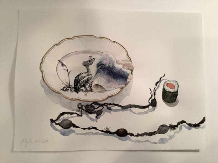 Nach dem Tod meiner Mutter erbte ich etwas Geld, damit bin ich losgefahren: Mit zehn Kilo Gepäck und 10.000 Mark, von denen 2.000 für den Flug draufgingen. In Kyoto habe ich in einem winzigen Zimmerchen gelebt und mir die Miete mit Putzen verdient. Die Lehrer der Kunsthochschule haben sich so gefreut, dass sich jemand aus Deutschland für die traditionelle japanische Malerei interessiert, dass sie mich umsonst studieren ließen. Also saß ich auf einer Matte, kopierte mit Tusche und Pinsel die alten Meister, und die japanischen Studenten haben sich halb kaputt gelacht über diese blonde Europäerin, die sich so ungeschickt anstellte. Ich habe bis heute Kontakte nach Japan und durfte 2023 und 2024 jeweils fünf Aquarelle zu einer Ausstellung im Metropolitan Museum in Tokyo schicken.