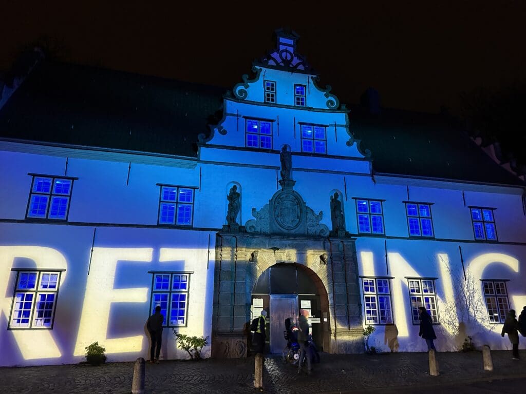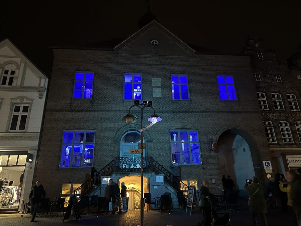 Bis zur nächsten Station sind es nur zwei Minuten Fußweg: Auch das alte Rathaus in der Einkaufsstraße leuchtet und zieht damit Menschen an und Blicke auf sich. Auch hier ertönt Musik und die meisten wählen die Panoramaperspektive, um das Werk von der gegenüberliegenden Straßenseite als Ganzes zu bestaunen und auch, um eine gute Sicht auf die hoch gelegenen Fenster oberhalb des Ratskellers zu erhaschen. Im Gebäudeinneren leuchten Quallen. Videoprojektionen fluten die Wände mit Wasser und zeigen das Element, dem die zweite Installation gewidmet ist. Ihr Titel lautet „Gezeiten“.