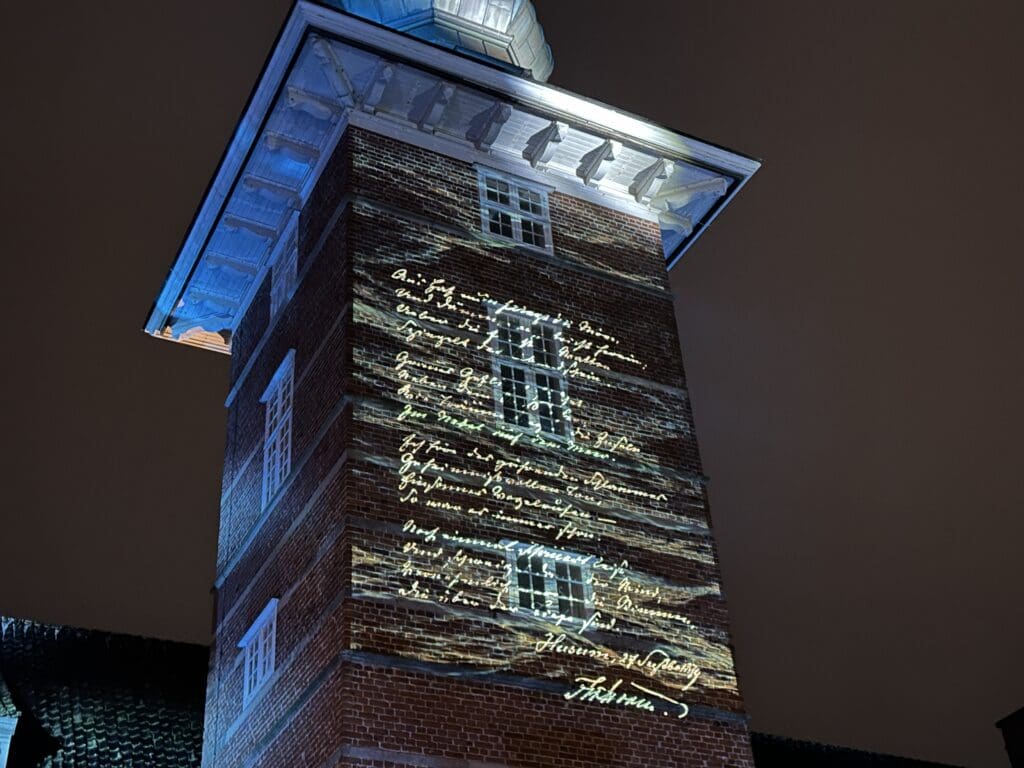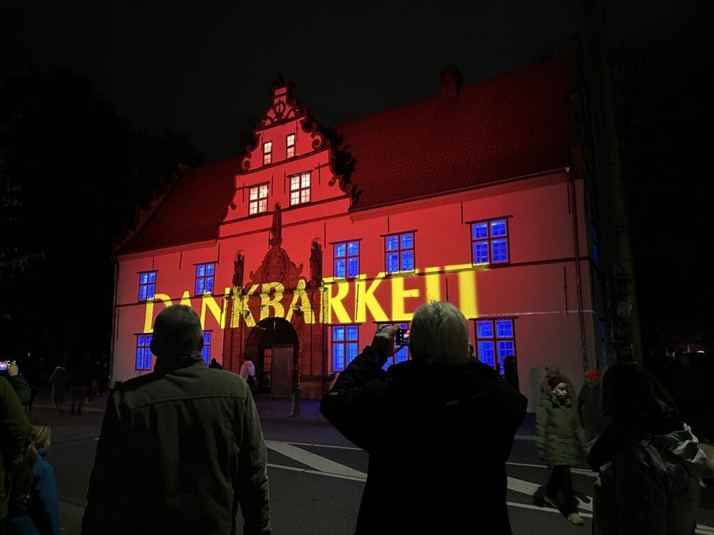 Der Schlossgang führt zur nächsten Station. Auch das historische Torhaus von 1612 ist zum Lichtspiel geworden. Aus den Fenstern knallen Farben, auf die Fassade werfen sich wachsende Wortprojektionen: Hingebung, Rettung, Dankbarkeit. Laut Programmflyer bezieht sich die dritte Station auf das Element Feuer und damit verbunden auf die Sage um die alte Tine: „Die Sage der alten Tine: eine kranke Fischersfrau setzt ihr Hab und Gut in Flammen, um die Menschen in Husum vor der aufkommenden Sturmflut zu retten. Die zerstörerische Energie des Feuers, Vernichtung, Vergänglichkeit und Strahlkraft als rettendes Signal – projiziert auf das historische Torhaus Husum.“