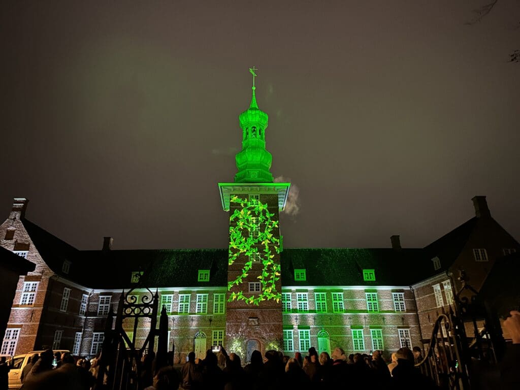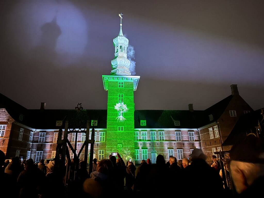 Der Lichtkegel über dem Schloss und die Menschenzüge lenken die Leute intuitiv zur nächsten Station. Vorm Schloss bleiben die meisten bereits am Schlosstor stehen, um das Spektakel anzuschauen. Auf dem Schlossturm klettern Pflanzen, schmiegen sich ans Gemäuer, aus Wurzeln wächst ein Baum. Aus dem Lautsprecher ertönt Theodor Storms Gedicht „Meeresstrand“. Zeitgleich wird es, wie mit einer Feder aus Licht auf den Turm geschrieben, in der Handschrift des Dichters. Zwei Kinder toben im Zentrum des Innenhofs, während das Publikum gebannt auf Abstand bleibt, um die Bewegung in ihrer Gänze zu erfassen. Das zugeordnete Element der vierten Station ist Erde.