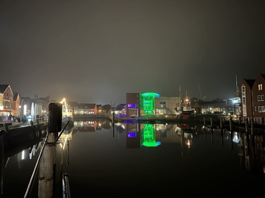 Nicht nur die Kirche, auch die Stadt ist belebt und beleuchtet in diesen Abendstunden. Das Husumer Wetter zeigt sich derweil, wie es sich für die „graue Stadt am Meer“ gehört: Es ist grau und diesig, die Himmelskulisse ist wie für das Lichtkunstfest gemacht, so als sei sie Teil der Inszenierung.