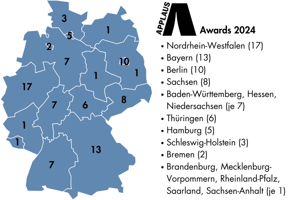 Das bevölkerungsstärkste Bundesland Nordrhein-Westfalen ist mit 17 APPLAUS-Awards der diesjährige Spitzenreiter, gefolgt von Bayern mit 13 Auszeichnungen (und der zweitgrößten Bevölkerung). Auf Platz drei des Rankings steht Berlin.