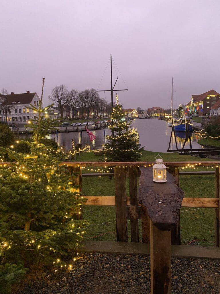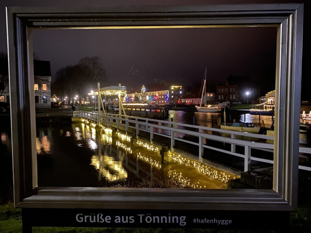 Danach wird es Zeit für einen Spaziergang durch die weihnachtlich in Szene gesetzte Stadt. „Tönning hat viele schöne Plätze zu bieten, so dass es schwer ist, sich auf einen bestimmten Platz festzulegen“, sagt Bürgermeisterin Dorothe Klömmer und gibt preis, dass sie es liebt, vom historischen Hafen über den Schlosspark und anschließend an der Eider entlang bis hin zum Badestrand zu spazieren. Dort die Natur, die Atmosphäre und den weiten Blick in Richtung Nordsee zu genießen. Es gibt also einiges zu entdecken. Wie zum Beispiel die festlich beleuchtete hölzerne Fußgänger Klappbrücke, deren Lichter sich im Hafenbecken spiegeln. Sie lädt geradezu ein, sie zu überqueren.