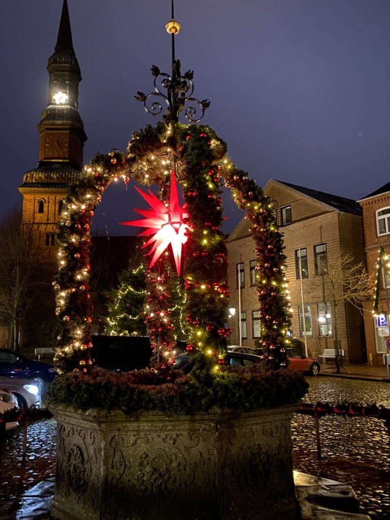 Am historischen Markplatz angekommen, ist der achteckige Sandsteinbrunnen mit Kronenaufbau schon von Weitem zu sehen, denn auch er hüllt sich in Weihnachtsglanz. Dahinter thront die St. Laurentius Kirche, deren Turm mit 62 Metern Höhe einer der höchsten in Schleswig-Holstein ist. „Hier sind wir fernab von Jubel und Trubel. Gerade die Kirche ist in diesen Tagen der absolute Gegenpol zum Packhaus“, sagt Tourismusdirektorin Monika Rulle. Wem also nach allem Adventsgestöber der Sinn nach einer Portion Ruhe steht, der begebe sich einfach für eine Weile in die St. Laurentius Kirche und lasse den Tag ausklingen.
