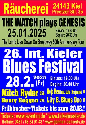 Das Internationale Kieler Blues Festival geht in die 26. Runde. In der Kieler Räucherei spielen: Mitch Ryder & Band (USA), Mojo Men feat. Lutz Krajenski (D), Henry Heggen (USA), und das Lily B. Blues Duo aus Schleswig-Holstein.