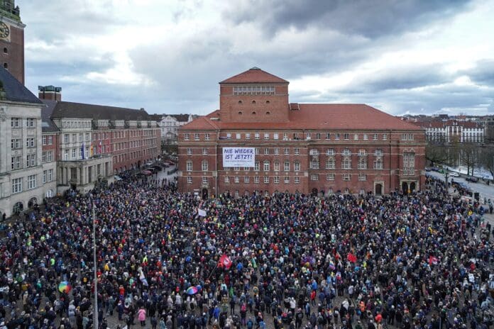 Du spielst an auf den Versuch von CDU-Kanzlerkandidat Friedrich Merz, mit Stimmen der rechtsextremen AfD eine Verschärfung des Migrationsrechts im Bundestag durchzusetzen. Das hat im ganzen Bundesgebiet Proteste ausgelöst. Prominente Parteimitglieder – zum Beispiel der Publizist und frühere Präsident des Europäischen Jüdischen Kongresses Michel Friedman – traten aus der CDU aus. Am Wochenende demonstrierten 160.000 Menschen in Berlin, mindestens 65.000 Menschen in Hamburg, in Kiel etwa 14.000. Die Gedenkveranstaltung am Montag wirkt da rückblickend wie der Auftakt zu einer Ereignis- und Protestreichen Woche.
