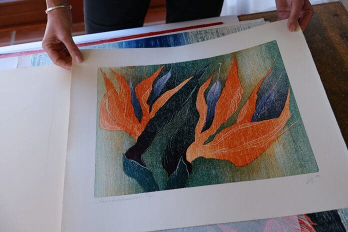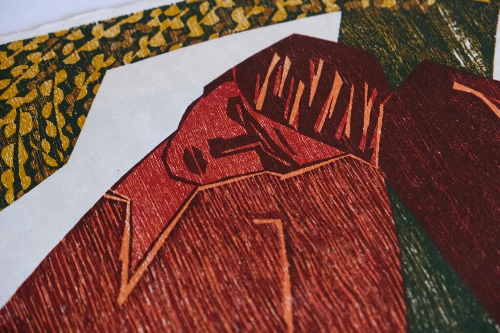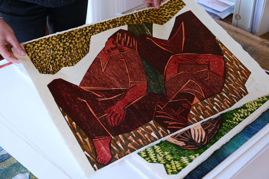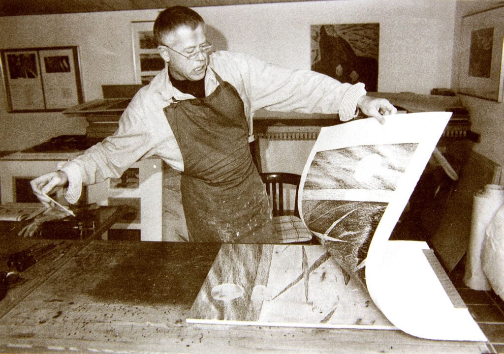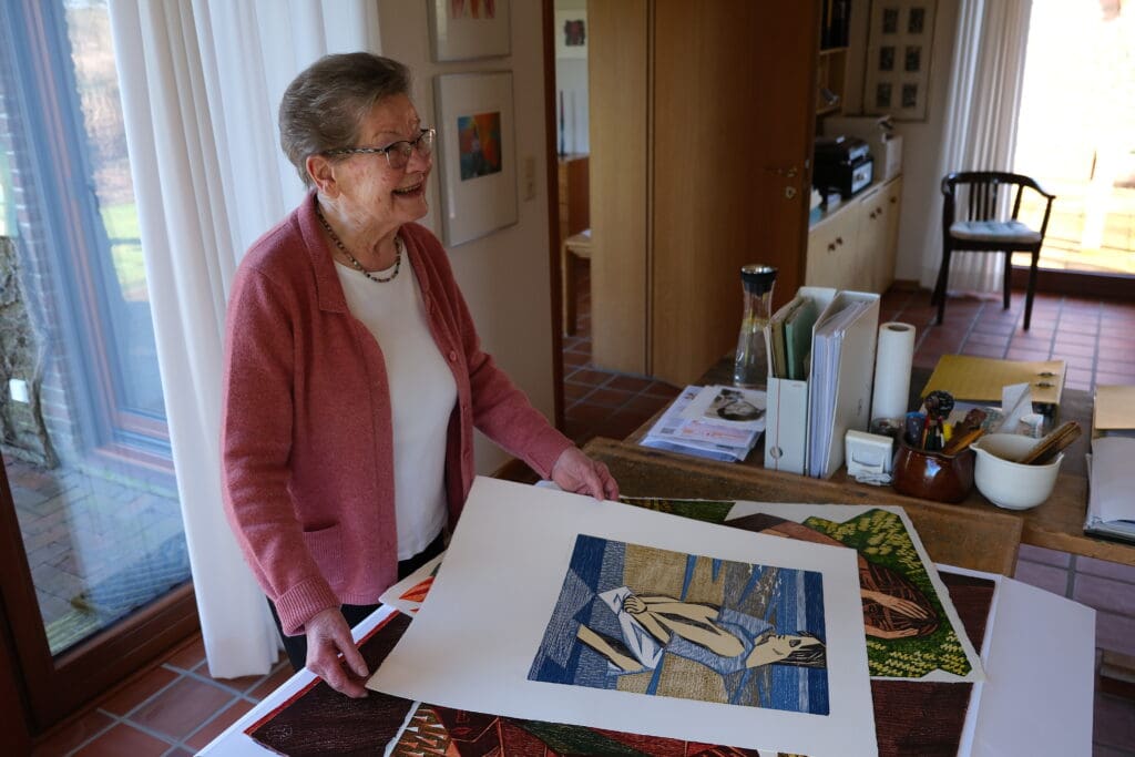 Gerhard Hermanns wurde 1935 geboren, wuchs im Rheinland auf, machte dort die Ausbildung zum Musterzeichner für Textilien. Neben der Arbeit lernte er in der Werkkunstschule in Dortmund sein künstlerisches Handwerk, im Abendstudium. Die Idee mit dem Holzschnitt kam aber erst später. „In dieser Hinsicht war er Autodidakt“, sagt Helene Hermanns. Und erinnert sich mit einem Schmunzeln an die ersten Druckversuche: „Das hat er mit Aquarellfarbe versucht. Das war wirklich nichts.“