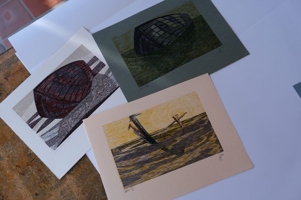 Später widmete sich Hermanns dem Verfall eben dieser Landschaft. Sein zweiter großer Zyklus, „Letzte Landschaften“, umfasst, nach dem Vorbild von Katsushaki Hokusais „Hundert Ansichten des Fuji“, genau hundert Motive, die für seine Heimat typisch waren. „Hier hat er mit, wie er selbst sagte, ‚Destruktionen‘ gearbeitet“, sagt Daniela Wehrmeier. Hermanns entwickelte ein Motiv, etwa einen Fischerkahn, der bei Ebbe auf Grund liegt. Nach dem ersten Druck bearbeitete er das Holz weiter, nahm Material ab, druckte erneut, wiederholte diesen Prozess mehrfach. So entstanden Serien von Bildern, die den Verfall zeigen: Der Kahn zeigt Risse, hat Löcher, am Ende liegt nur noch ein trostloses Gerüst im Watt. Der Verfall im Motiv spiegelt sich in der Zerstörung des Materials wieder: Die Druckplatten sind nicht wiederherstellbar.